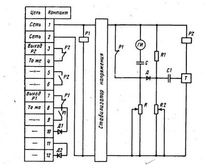 Когда напряжение на конденсаторе достигает уровня опорного напряжения, снимаемого с делителя на резисторах R1 и R2, открывается диод Д, импульсы генератора ГИ проходят на вход триггера Т и устанавливают его в положение, при котором подается напряжение на реле Р2. Реле Р2 срабатывает и переключает выходные контакты. Выдержка времени заканчивается. При снятии напряжения питания реле возвращается в исходное состояние. Выдержка времени регулируется ступенчато путем изменения сопротивления резистора R, который выполнен в виде набора резисторов.