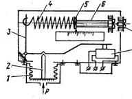 Кинематическая схема реле давления масла РДК-3: 1 — сильфон; 2 — шток; 3 — рычаг; 4 — пружина; 5, 7 — пробки; 6 — винт ходовой; 8 — микровыключатель