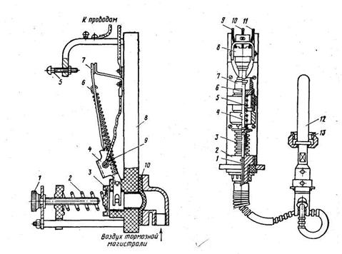 Реле давления воздуха АК-11Б предназначено для автоматического управления пуском компрессора в зависимости от давления сжатого воздуха в тормозной магистрали. Реле давления воздуха исключает возможность включения нагрузки при недостаточном давлении воздуха в тормозной магистрали. Под действием давления мембрана 10, изготовленная из листовой морозостойкой резины, прогибается и давит на шток 3, который, преодолевая усилие сжатой пружины 2, перемещает рычаг 4. Поворачиваясь вокруг оси, рычаг 4 и пружина 6 перебрасывают планку с подвижным контактом 7 от неподвижного контакта на винт-контакт 5, т. е. произойдет размыкание контактов. При снижении давления воздуха в тормозной магистрали усилием пружины шток возвращается в исходное положение, вновь замыкая контакты. Давление замыкания регулируется винтом 1, а давление размыкания — винтом 5, при этом раствор контактов должен быть в пределах 6—12 мм. Перепад давления, т. е. разница давления размыкания и замыкания, составляет 0,15—0,18 МПа.