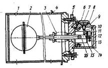 Реле уровня воды ДРУ-1: 1 — ограждение; 2 — поплавок; 3 — сильфон; 4 — водяной бак; 5, 8 — фланцы; 6 — крышка; 7 — кольцо пружинное; 9 — корпус; 10 — стопорный винт; 11 — микровыключатель; 12 — крышка; 13 — регулировочный болт; 14 — уплотнение; 15 — кронштейн; 16 — рычаг