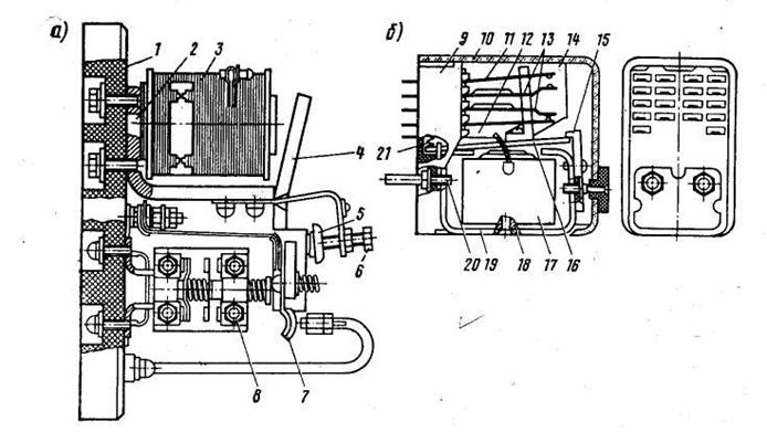 Реле управления:а типа Р-45М; б — типа ТРПУ-1;1 — панель; 2 — ярмо; 3 —катушка; 4 — якорь; 5 — пружина; 6 — болт регулировочный; 7 —пальцевый контакт; 8— мостиковый контакт; 9 — пластмассовый корпус; 10 — кожух; 11 — подвижная пластина замыкающего контакта; 12 — подвижная пластина размыкающего контакта; 13 — неподвижные пластины контактов; 14 — траверса; 15 — угольник; 16 — якорь; 17— катушка; 18 — сердечник; 19 — скоба; 20 — винт; 21 — пружина