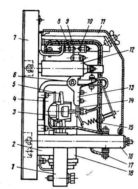 Реле ограничения тока ПР-27АЗ: 1 — выводы токовой катушки; 2 — изоляционная планка; 3 — сердечник; 4 — катушка напряжения; 5 — токовая катушка; в — ось; 7 —панель; 8, 10 — неподвижные контакты; 9 — подвижной контакт; 11 — кожух;12 — конденсатор; 13 — рычаг; 14 — немагнитная планка; 15 — пружина; 16 — изоляционная колодка; 17 — контактные зажимы; 18 — резистор
