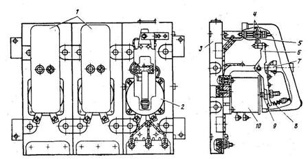Блок боксования ББ-320А:1 — реле РК-221; 2 — реле РК-231; 3 — панель; 4 — неподвижный контакт; 5 — замыкающий контакт; 6 — рычаг; 7 — ярмо; 8—регулировочная пружина; 9 — якорь; 10 —втягивающая катушка