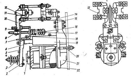 Реле времени РЭВ-800: 1 — сердечник' 2— немагнитная прокладка; 3— отжимная пружина; 4, 8— гайки; 5 — якорь; 6 —скоба: 7 — пластина: 9, 15 — планки; 10, 14 — изоляционные колодки; 11 — узел подвижного контакта; 12, 17 — шпилька; 13 — пластинки неподвижных контактов; 16 — возвратная пружина, 18 — угольник; 19— демпфер; 20 — болт; 21 — алюминиевое осювание; 22 — катушка